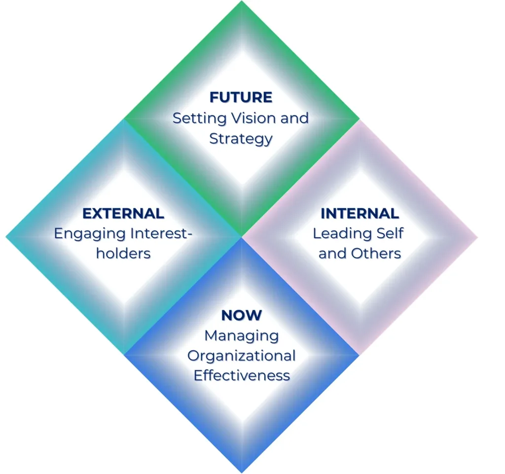 The role of the manager in the career development sector is complex, involving a wide range of competencies that combine and re-combine in many ways. The following four-part model organizes the full range of managerial competencies included in the framework. The model recognizes that the manager/leader’s role must look to the future while ensuring organizational effectiveness now. It also acknowledges that the manager/leader needs to engage with others external to their team as well as those within the team, including themselves.