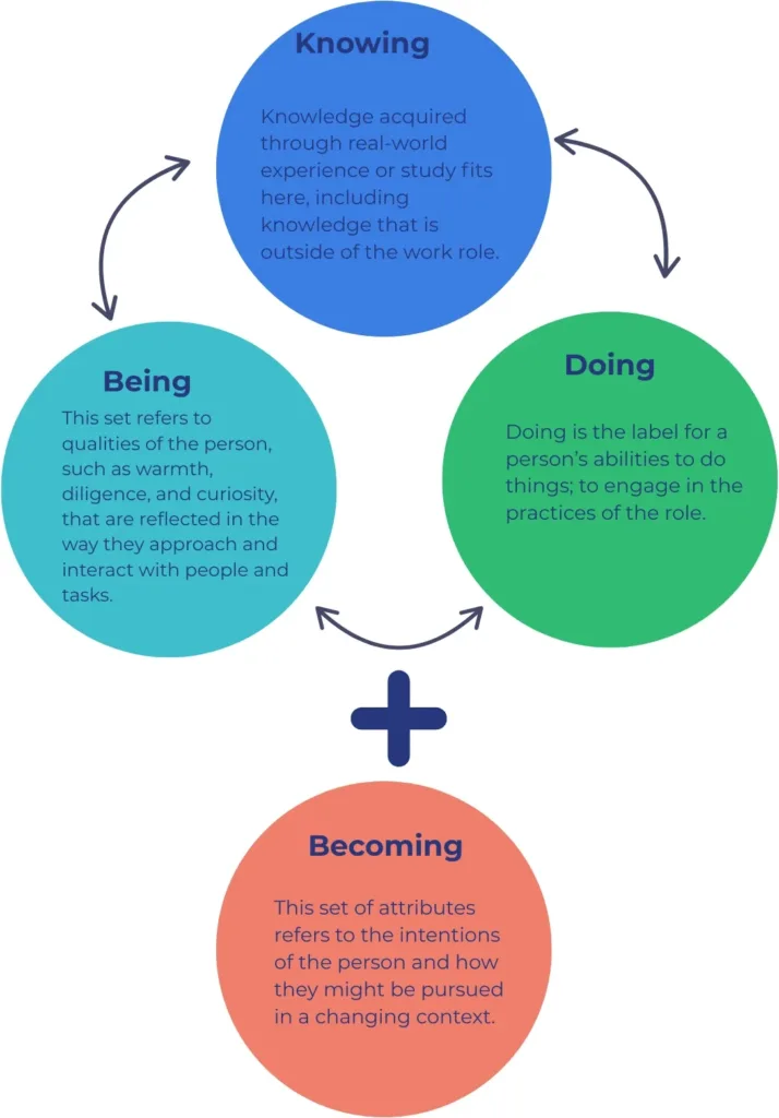 You are much more than a collection of competencies; you come to work as a whole person, as do your team members. A way of thinking about abilities with this lens has been developed by the Université de Sherbrooke. The model below describes a collection of attributes that people bring to their roles, attributes that include much more than just specific competencies.